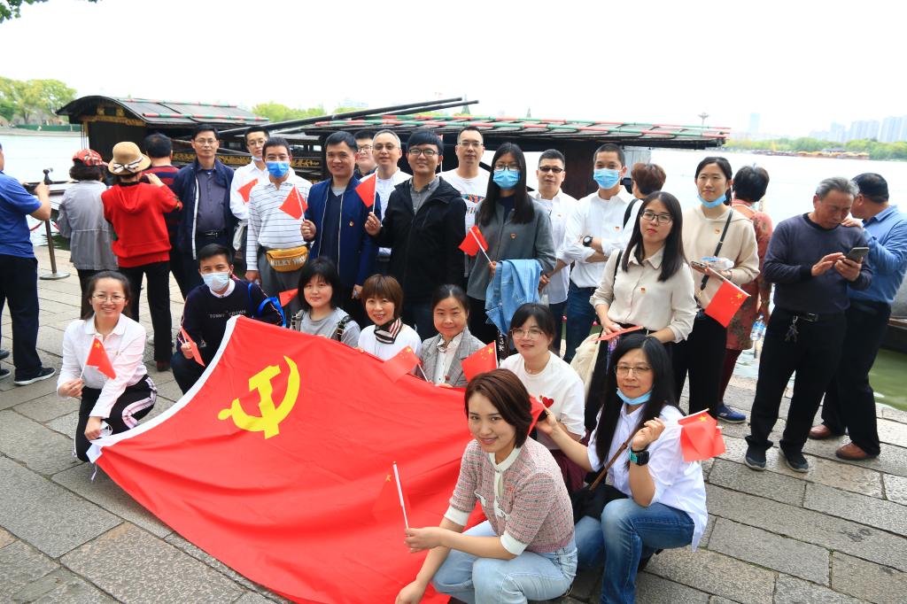 2021年4月25日下午,taptap点点官方网站教工党支部组织党员教师们前往南湖开展“建党百年 薪火传承”环南湖七·一公里健步走主题党日活动,集体瞻仰红船,重温入党誓词。