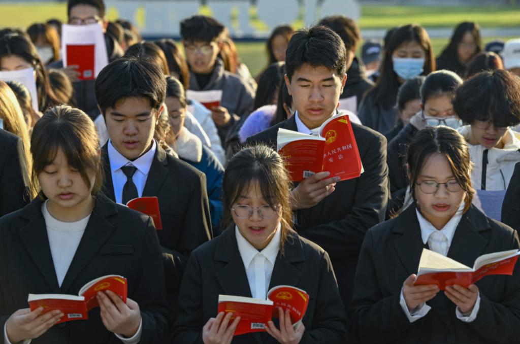 宣誓仪式上,全体宣誓师生面向国旗列队肃立,由法学221班王珽同学领誓,全体人员齐声跟诵誓词,向宪法和人民作出庄严承诺。宣誓结束后,学生第三党支部书记张鹤竞、法学社吴天天同学分别作国旗下讲话,号召广大青年学宪法讲宪法,让宪法法律的权威内化为师生们的衷心拥护和真诚信仰。
