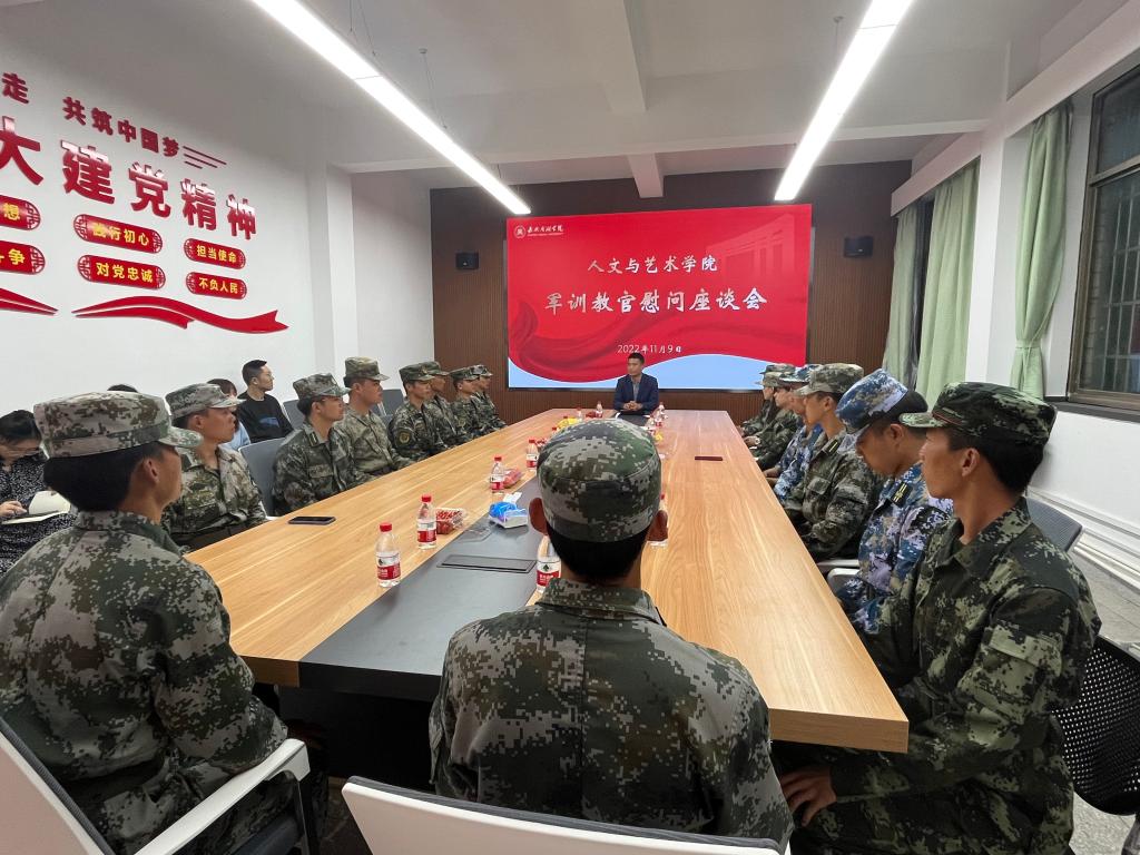 为高质量完成军训任务,确保军训工作取得实效,2022年11月9日下午,taptap点点官网组织召开军训教官慰问座谈会,院党委副书记杨燕群、全体辅导员及学生教官们参加座谈会。