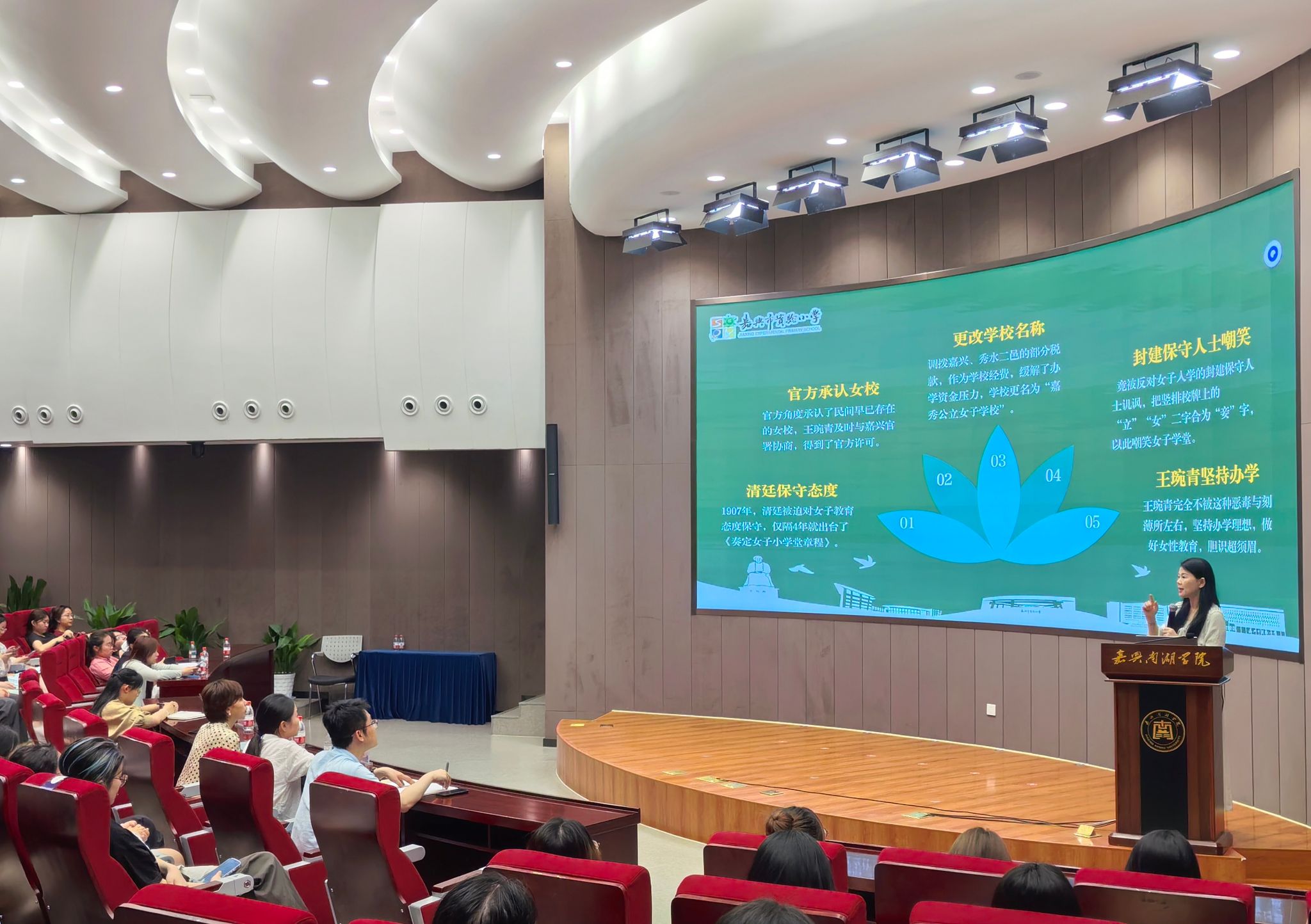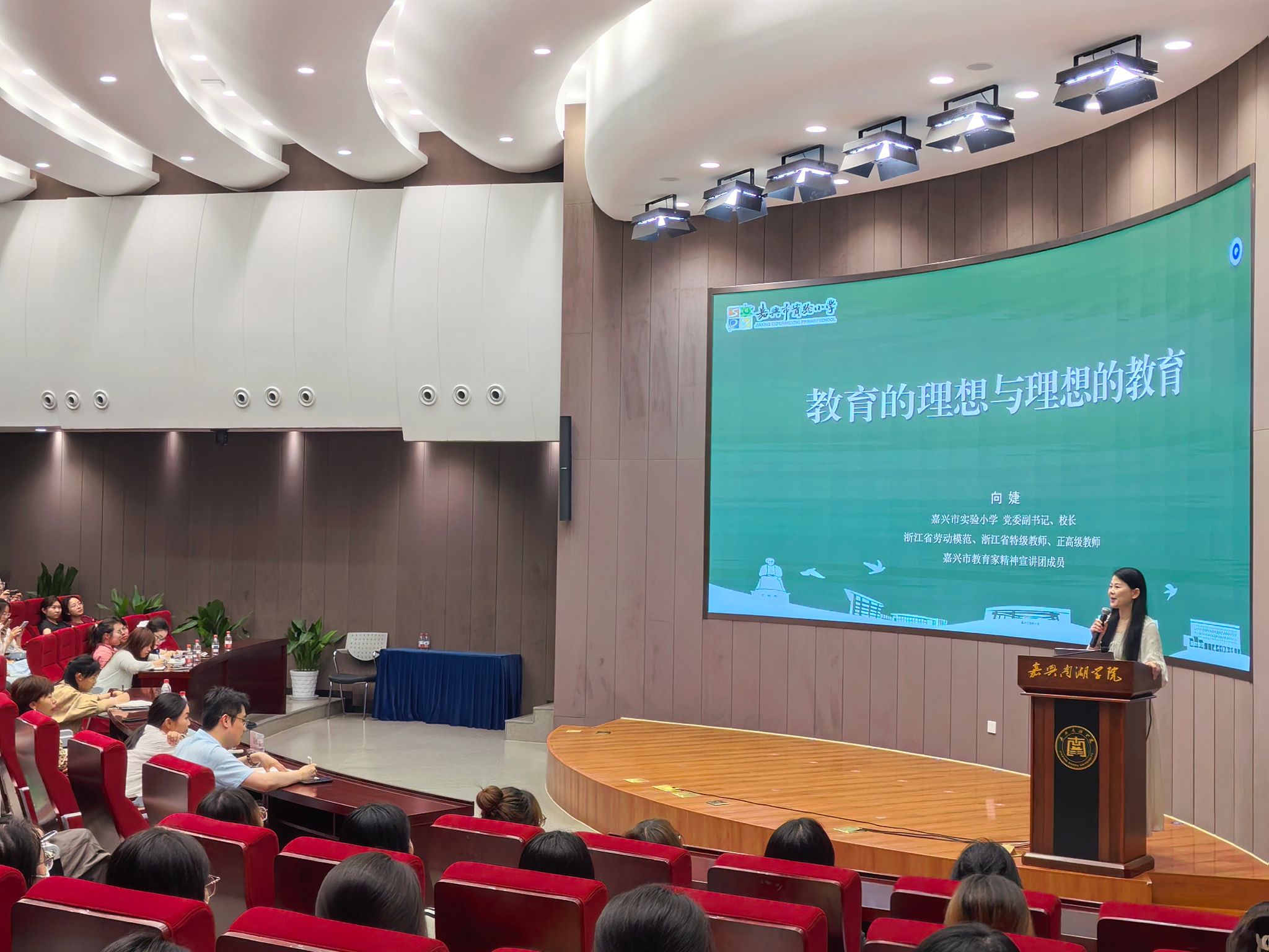 主讲嘉宾向婕老师以“教育的理想与理想的教育”为题,从“追光者--追寻教育理想”和“点灯人—叩问理想教育”两方面解读劳模精神,并结合自身从教经历诠释教育家精神。她以办学治校历史、榜样教师故事、个人成长发展等内容生动呈现育人精神的传承,让在场师生备受启发。