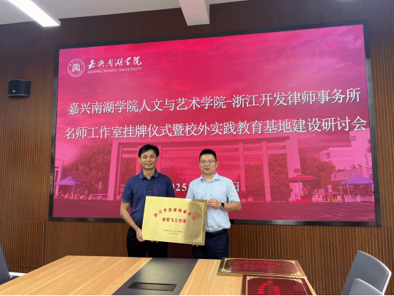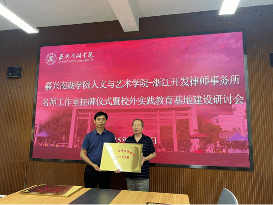 随后,进行名师工作室授牌仪式。由赵院长向任汝平教授、郑诗贵主任、宋军飞律师进行授牌。浙江开发律师事务所的任汝平律师,原嘉兴学院南湖学院法学专业负责人,教授,退休后为浙江开发律师事务所合伙人,专职律师,执业经验丰富。郑诗贵律师,华东政法大学刑法学硕士,曾任检察官十余年,浙江开发律师事务所执行主任,嘉兴市律师协会行政专业委员会主任,在刑事案件、行政诉讼领域有丰富的理论与实践经验。宋军飞律师,嘉兴学院南湖学院法学专业2009届优秀毕业生,浙江开发律师事务所合伙人、嘉兴市律协网络信息专业委员会副主任、嘉兴市破产管理人会员交流和对外联络宣传委副主任、嘉兴仲裁委仲裁员,被评为“嘉兴市优秀青年律师”,擅长劳动纠纷、知识产权、合同纠纷案件的代理。