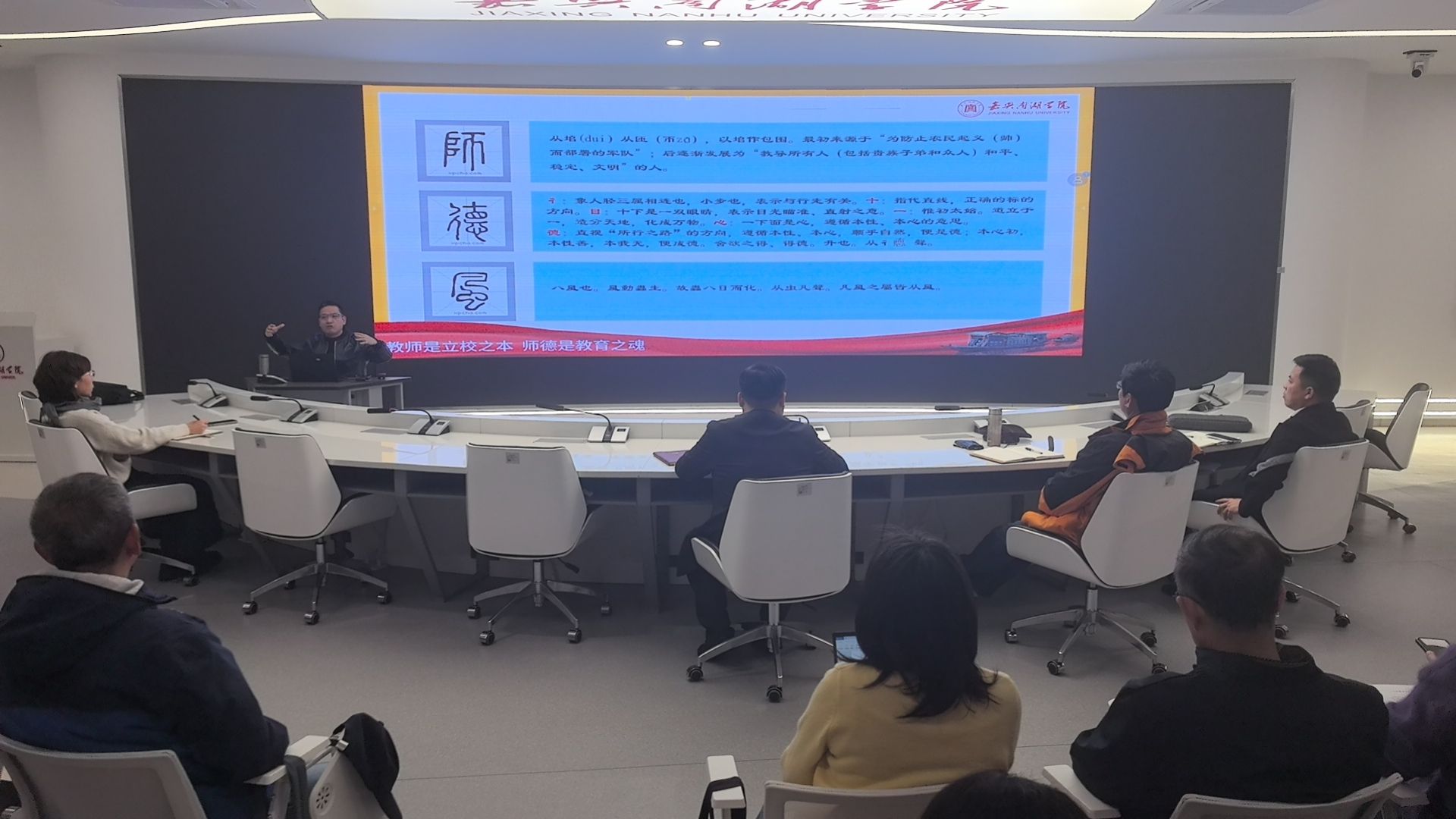 授课中,贾文胜引经据典,系统梳理了从孔子“有教无类”到陶行知“捧着一颗心来,不带半根草去”等历代教育家的师德理念,展现了中华师道精神的赓续与发展。同时,他结合新时代“四有”好老师标准——有理想信念、有道德情操、有扎实学识、有仁爱之心的党和人民满意的好老师,强调这是当前师德师风建设的核心导向,也是每一位教师应当追求的职业境界。