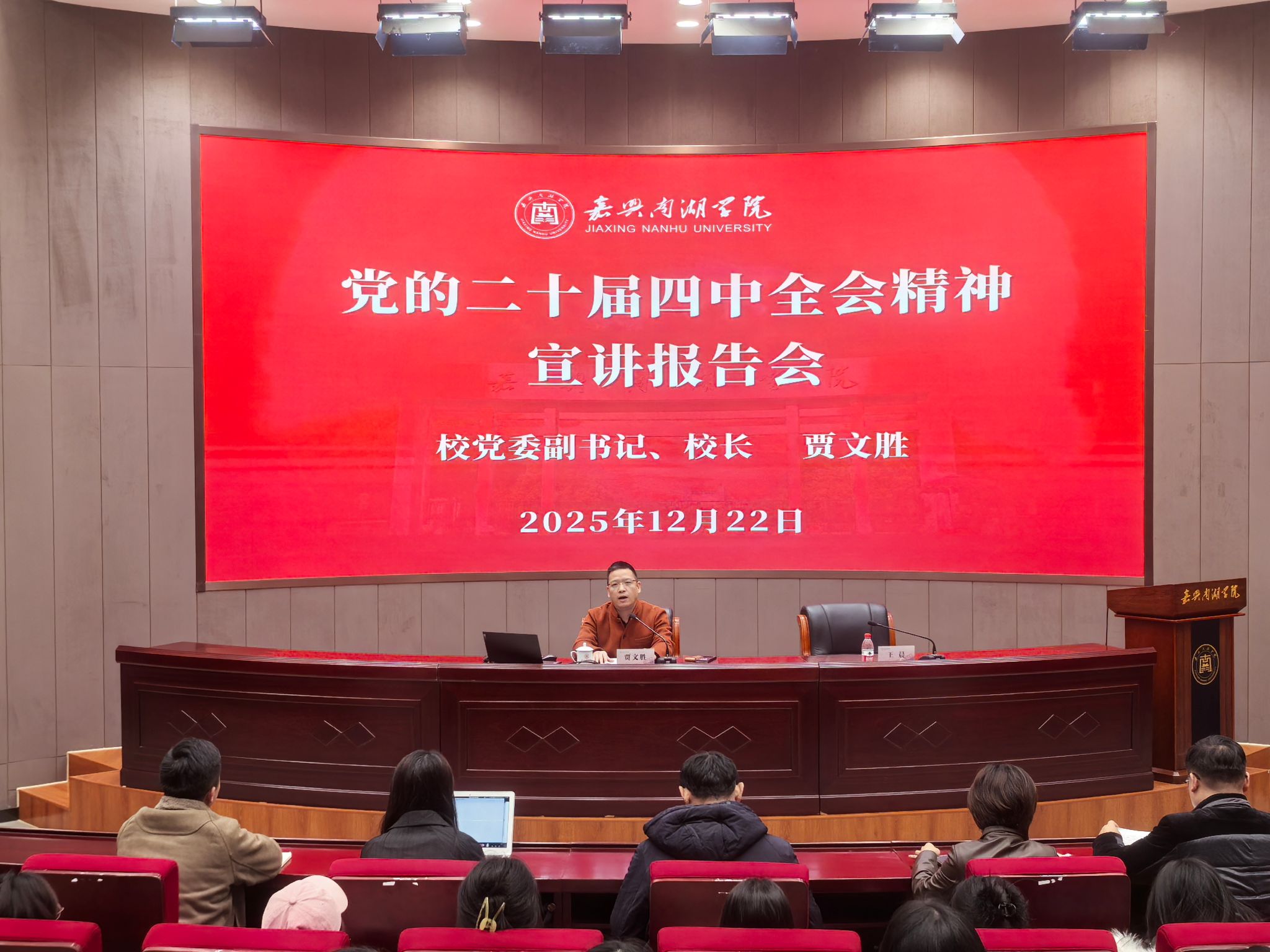 贾文胜聚焦宣讲主题,围绕学习贯彻习近平总书记在党的二十届四中全会上的重要讲话精神和“十五五”规划建议,从深刻认识全会召开的时代背景、重大意义、核心要义和实践要求等方面对全会精神进行系统宣讲,并结合高等教育发展与学校办学实际,阐释了“十五五”时期经济社会发展的指导思想、重大原则、主要目标、战略任务和重大举措,贯彻落实全会精神要着重把握的重点等核心内容,引导广大师生深刻领会党中央的战略部署和民族复兴的宏伟蓝图。
